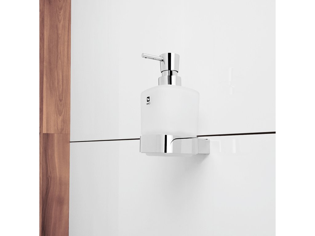 Nástěnný dávkovač tekutého mýdla. Pumpička a úchyt mosaz / chrom. Nádobka z matného skla, 300 ml.