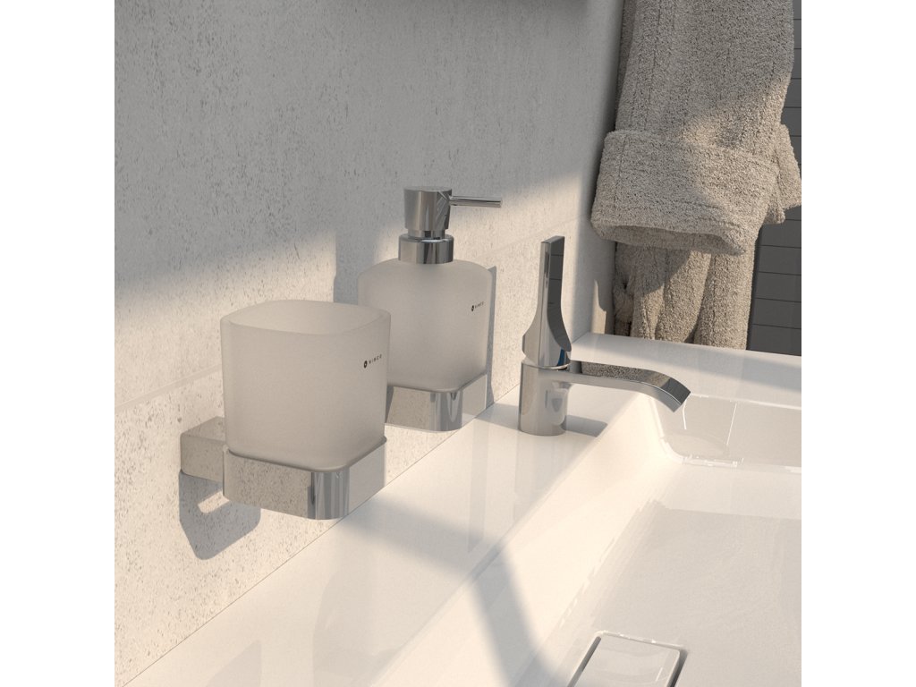 Nástěnný dávkovač tekutého mýdla. Pumpička a úchyt mosaz / chrom. Nádobka z matovaného skla, 300 ml.