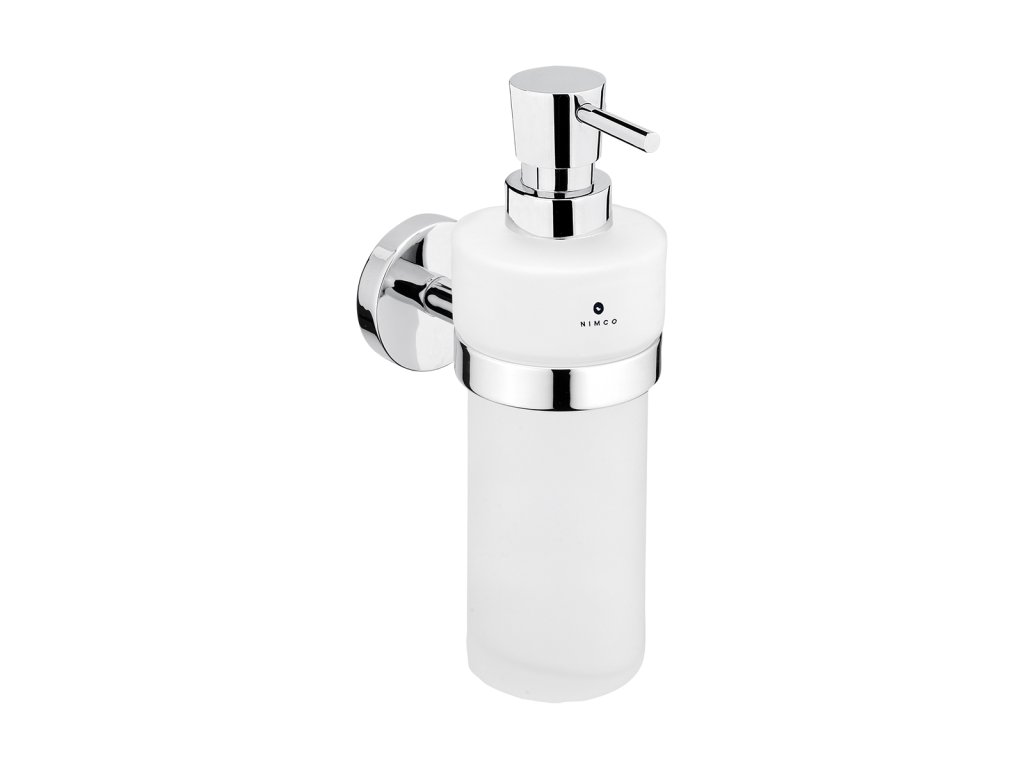Nástěnný dávkovač na tekuté mýdlo. Nádobka z matovaného sklo. Pumpička mosaz/chrom. Objem 250 ml.