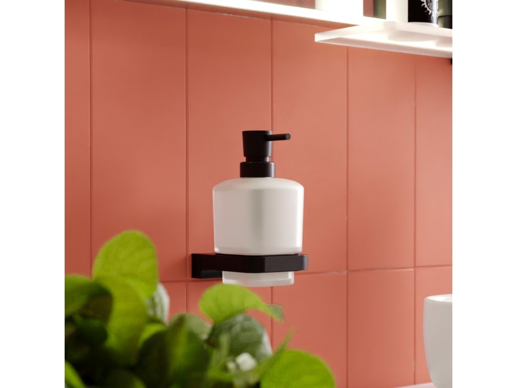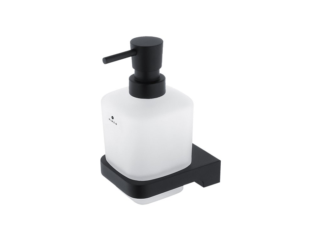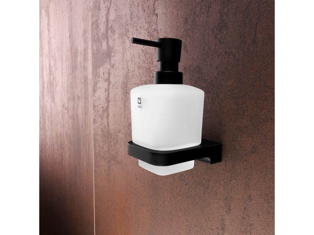 Nástěnný dávkovač na tekuté mýdlo o objemu 300 ml. Nádobka matované sklo. Pumpička mosaz/černý mat.
