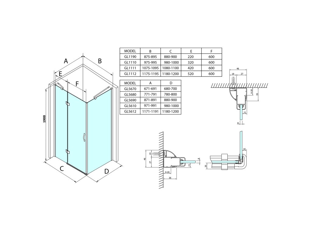- Přístěnný profil umožňuje vyrovnání nerovností stěn až do 20 mm