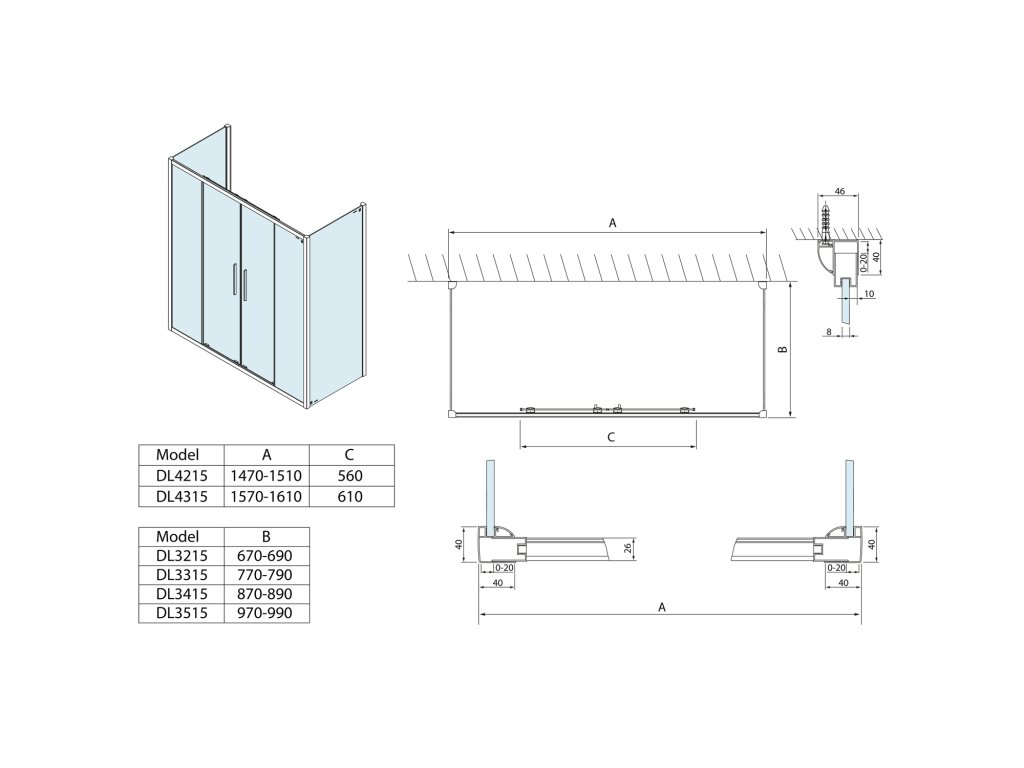 - Snadnou montáž umožňuje výsuvný stěnový profil v rozmezí 0-20 mm