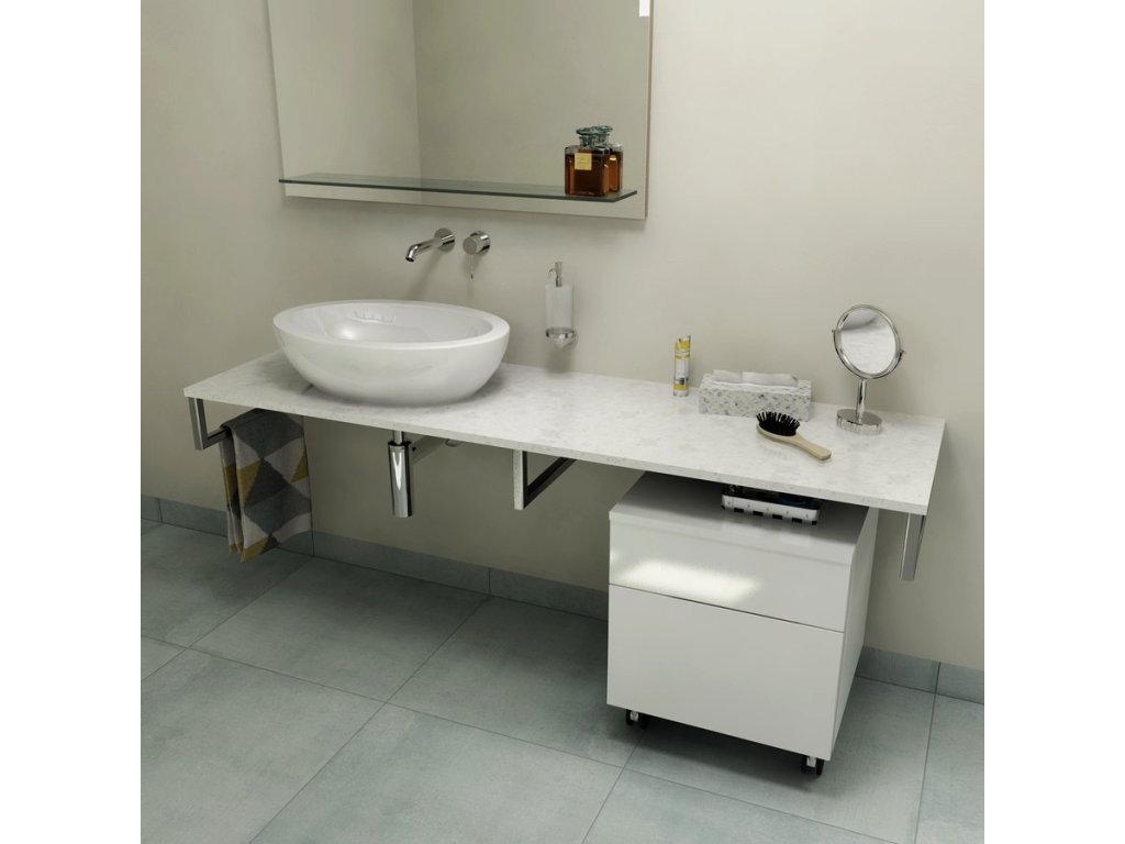 Desky doporučujeme doplnit umyvadly na postavení. Otvory pro odpad umyvadla a stojánkovou vodovodní baterii lze vyvrtat před montáží desky korunkovým vrtákem. Na přání je možné otvory připravit už ve výrobě dle dodaného výkresu. Taktéž lze zhotovit libovolný rozměr desky až do 250 cm. V tomto případě je cena na dotaz, pro kalkulaci ceny kontaktujte, prosím, naši podporu.