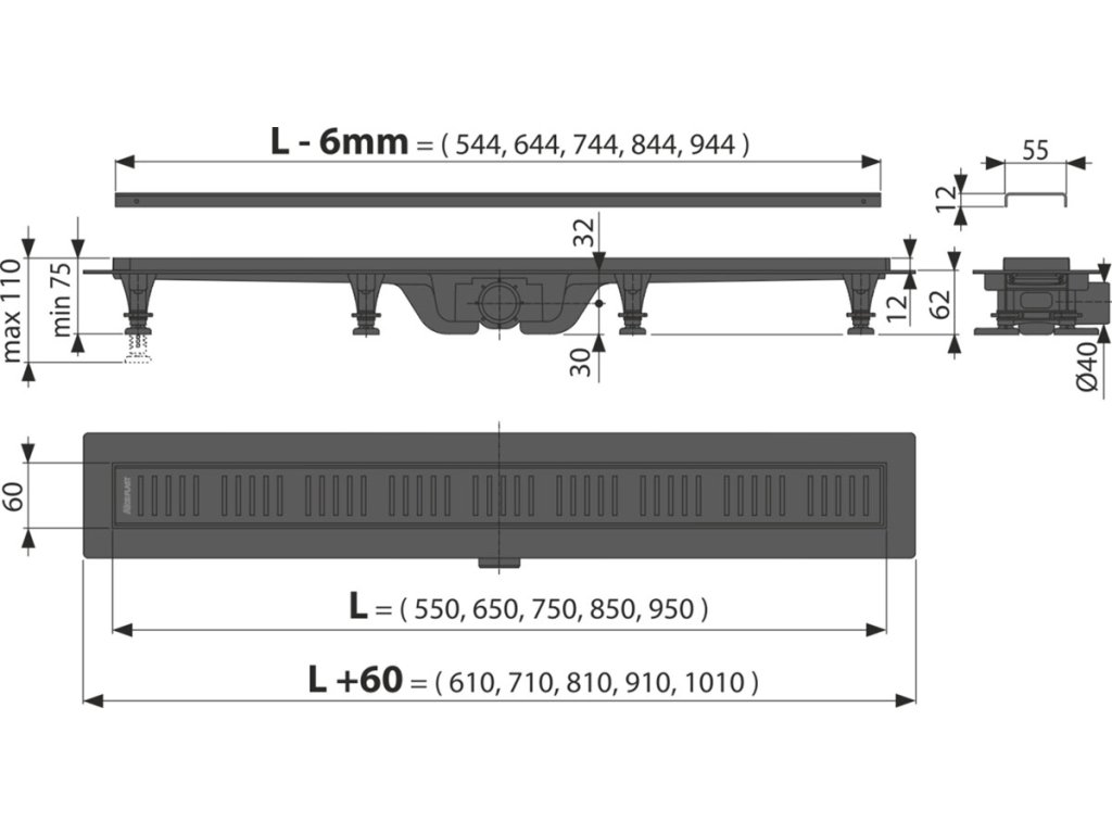 • Technické parametry Zápachová uzávěra kombinovaná s vodním sloupcem 29 mm Průtok s vtokovou mřížkou 28 l/min Odolnost zápachové uzávěry proti tlaku 640 Pa Průměr odpadního potrubí 40 mm Minimální tloušťka betonu 62 mm Celková stavební výška 75 – 110 mm Třída zatížení K3 300 kg
