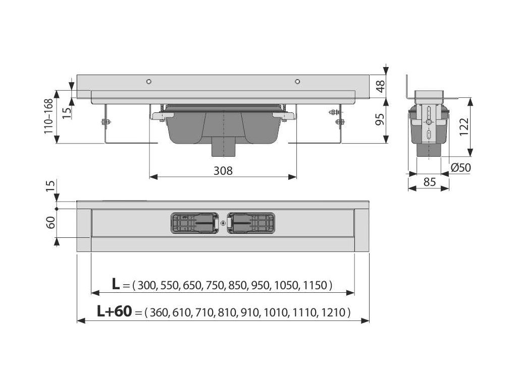 Alcadrain APZ1016-850 Podlahový žlab WALL pro plný rošt a s pevným límcem ke stěně