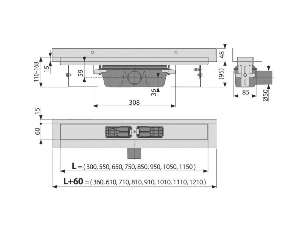 Alcadrain APZ16-1150 Podlahový žlab WALL pro plný rošt a s pevným límcem ke stěně