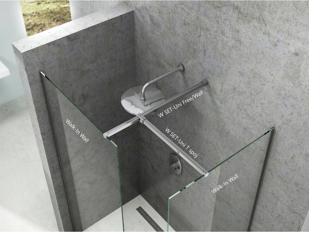 Set kovových částí pro sprchové kouty Walk-In Double Wall. Délka spojovací vzpěry je 1200 mm a určuje šířku vstupu. Lze ji libovolně zkrátit.