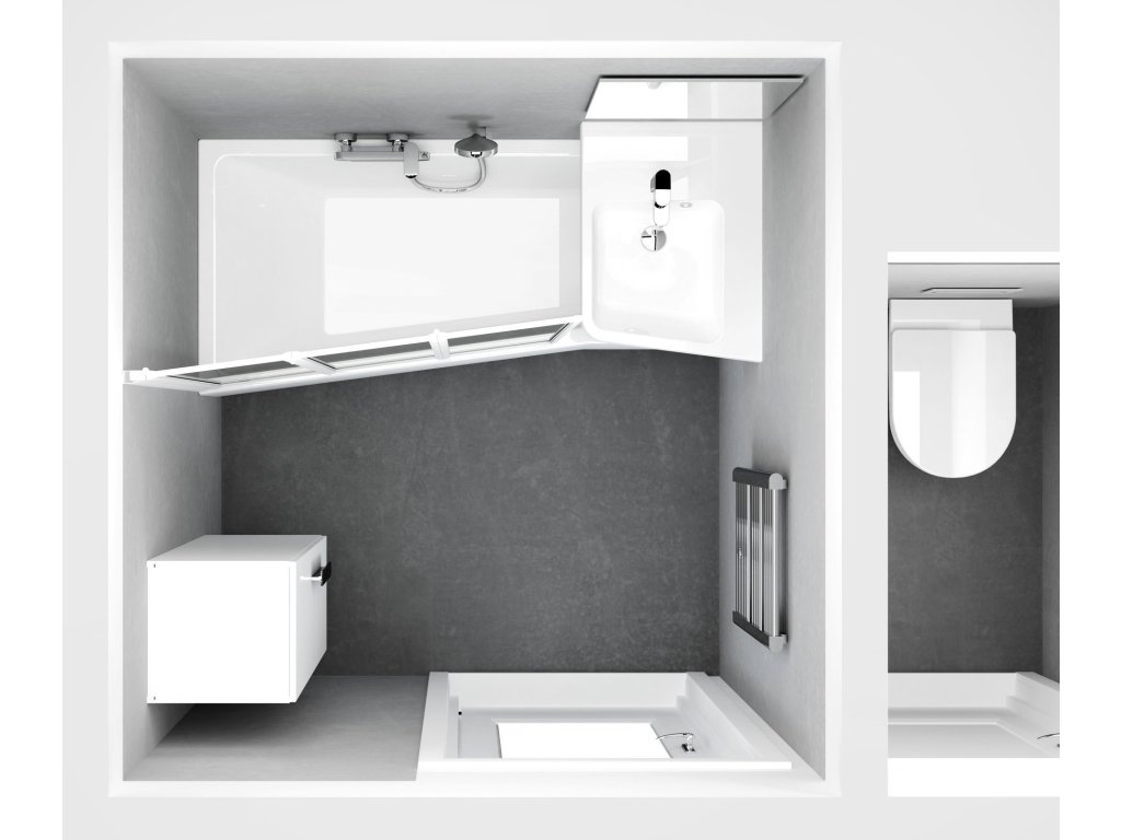Vana je určena k obložení. Preferujete rychlé a jednoduché řešení? Zvolte panely z akrylátu. Instalace zabere jen pár minut a prostor pod vanou bude stále snadno přístupný.Koncept pro nejmenší koupelny