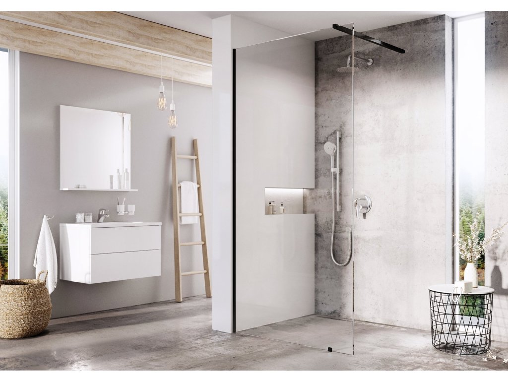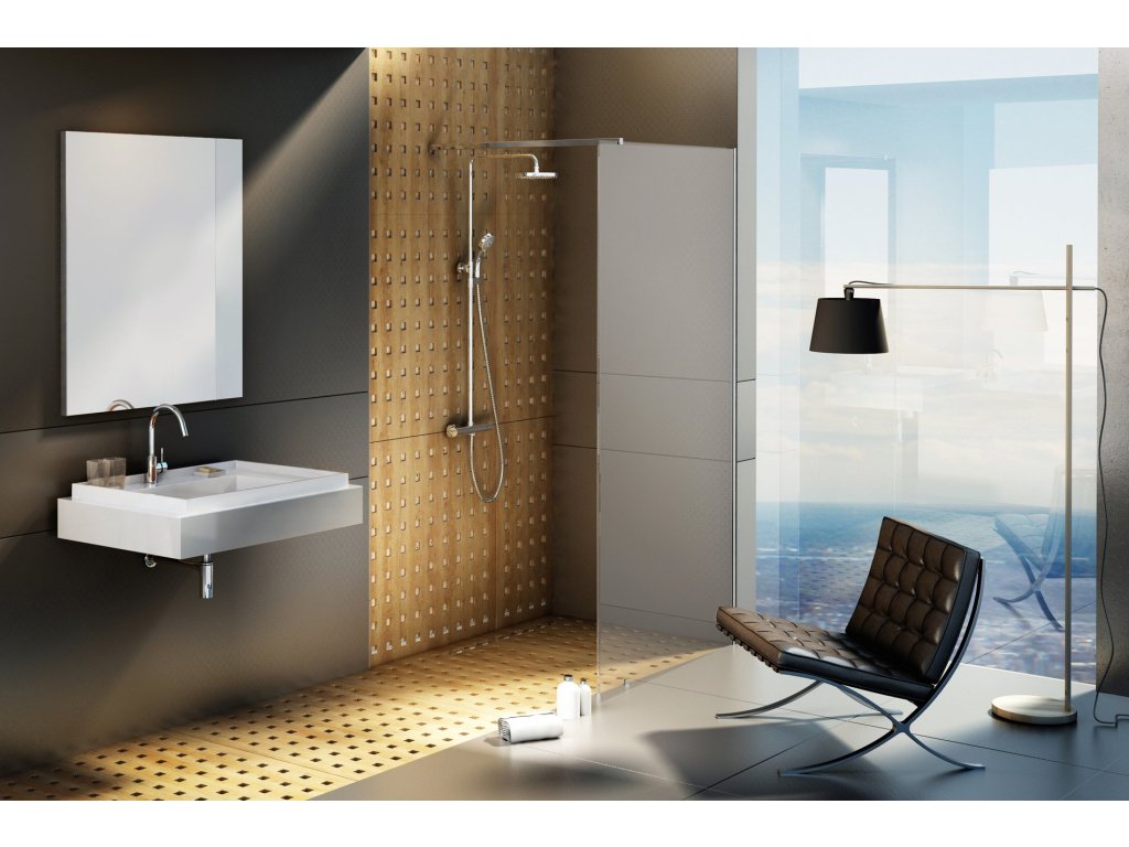 Sprchový kout Walk-In Wall tvoří tvrzené bezpečnostní sklo o tloušťce 8 mm. Stabilitu výrobku zajišťuje kovová vzpěra, která určuje šířku otevřeného vstupu.