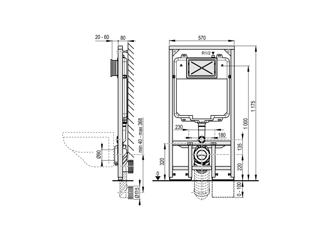 Pro montáž závěsného WC s připojovací roztečí 180 mm nebo 230 mm