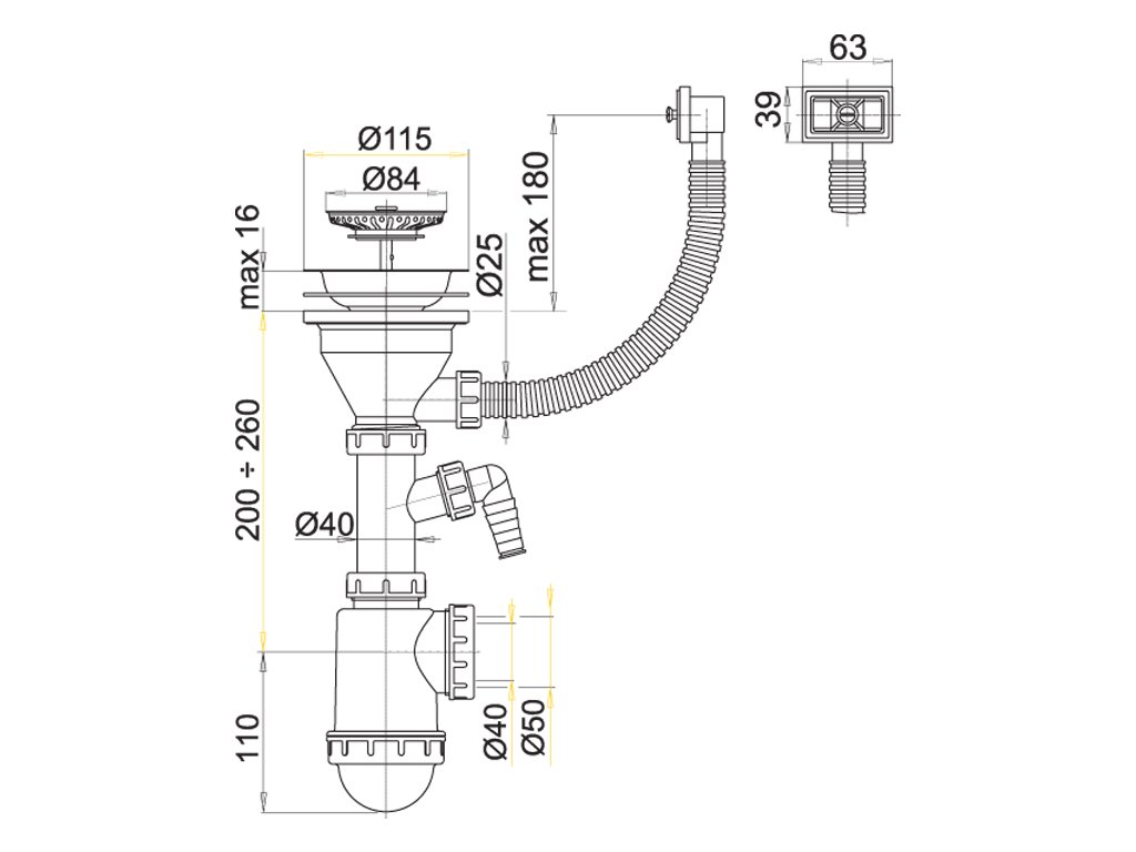 • mřížka výpusti z leštěného nerezového plechu - průměr 115 mm • vývod odpadu připraven pro napojení odpadní trubky – průměr 50 nebo 40 mm • s přípojkou pro myčku nebo pračku • pro dřezy s přepadem