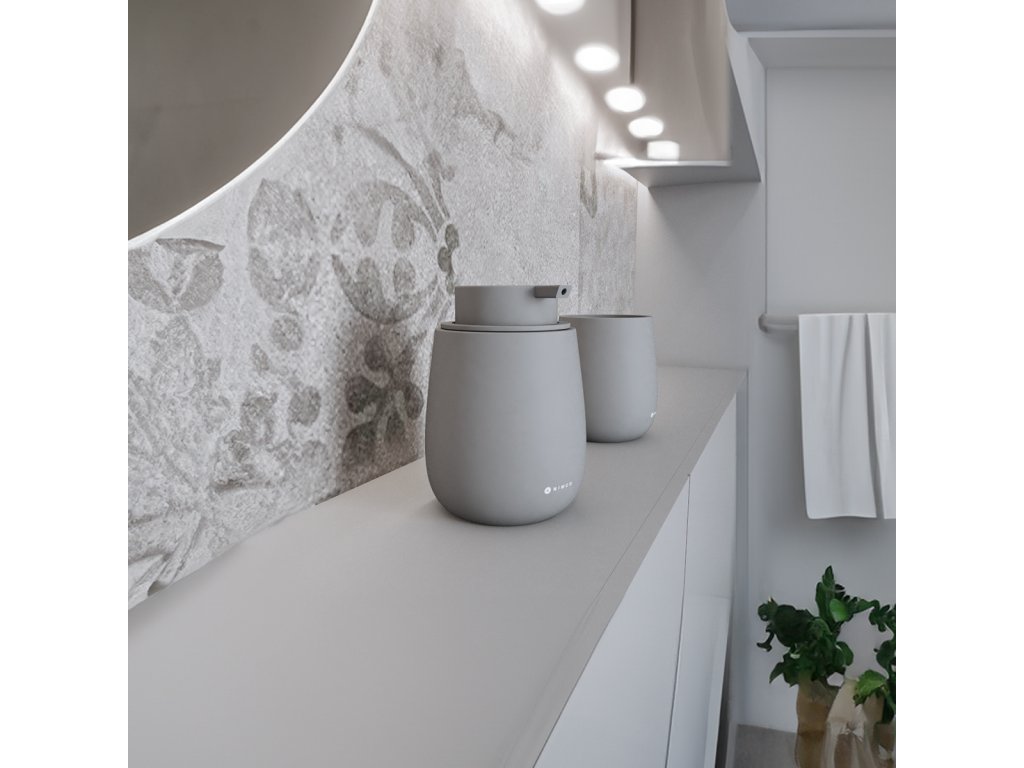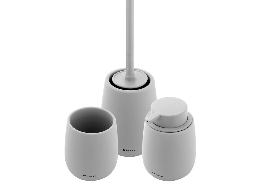 V sadě dávkovač tekutého mýdla, pohárek na kartáčky a WC kartáč. Nádobky keramické světle šedé matné. Objem dávkovače 425 ml. Pumpička plast. Rukojeť kartáče nerez ocel. Soft-touch povrch.