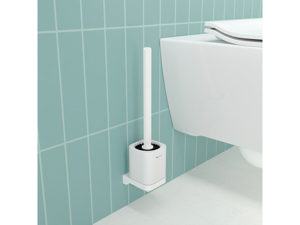 WC štětka s masivní hranatou rukojetí z mosazi. Keramická nádobka. Rukojeť kartáče bílý mat.