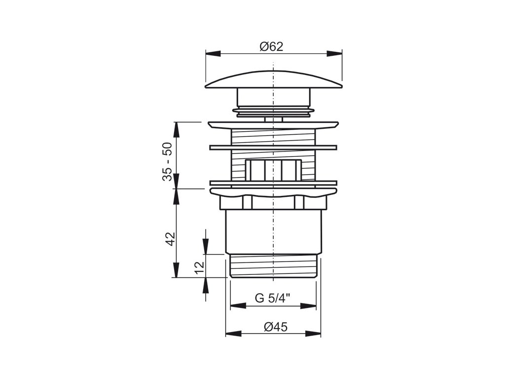 • prostorově úsporná umyvadlová výpust • závit pro připojení k umyvadlovému sifonu 5/4" • tělo výpusti je vyrobeno z kvalitní mosazi • pochromování je odolné proti mechanickému poškození • s konstrukční úpravou pro použití v umyvadlech s přepadem • kovová pochromovaná zátka s průměrem 62 mm • dlouhá životnost mechanismu click/clack