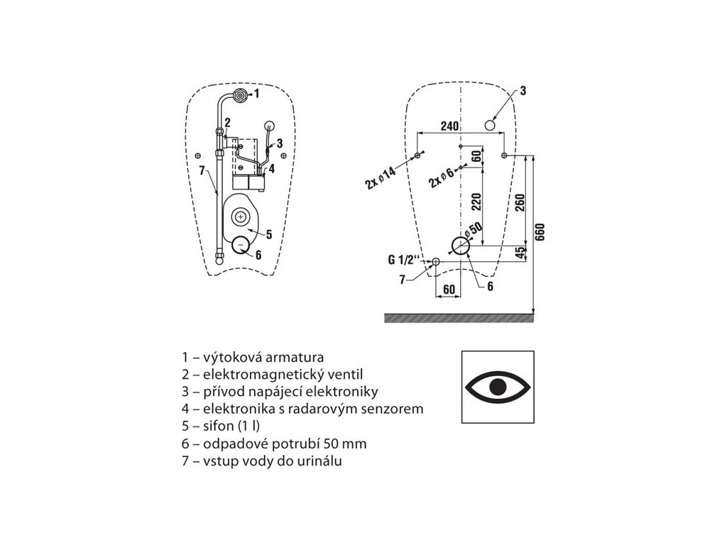 - pisoár s radarovým senzorem a vnitřním přívodem vody. S radarovou elektronikou na montážní liště - napájení 24V.