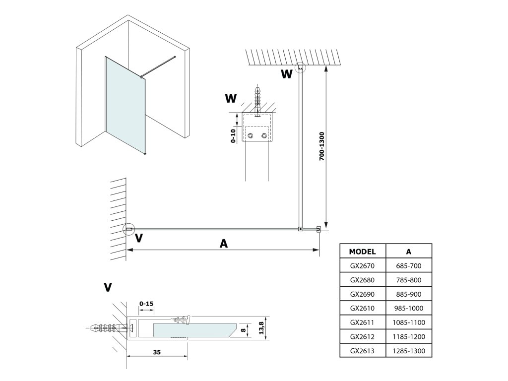 - Zástěny v šířkách 700 až 1400 mm