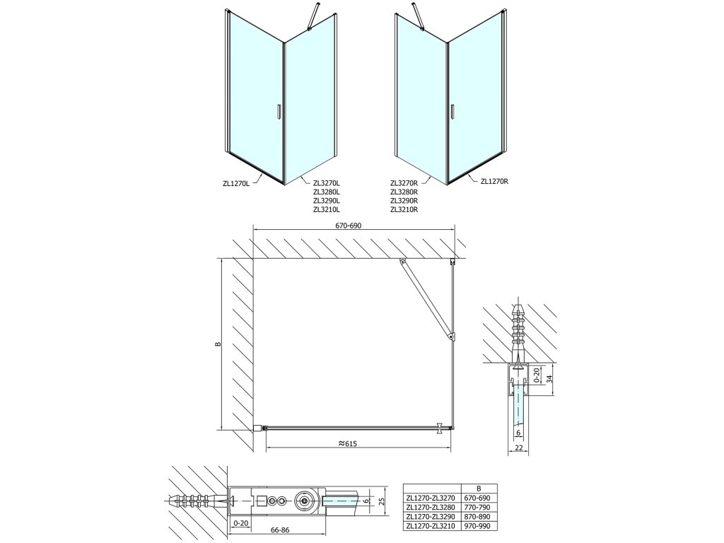 - Skládací dveře 700 až 900 mm v provedení levá a pravá lze instalovat do niky nebo v kombinaci L/R vytvořit čtvercovou nebo obdélníkovou zástěnu s rohovým vstupem
