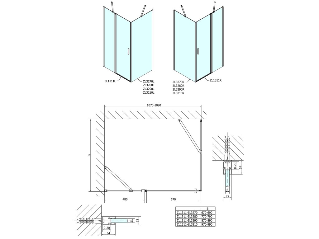 - Skládací dveře 700 až 900 mm v provedení levá a pravá lze instalovat do niky nebo v kombinaci L/R vytvořit čtvercovou nebo obdélníkovou zástěnu s rohovým vstupem